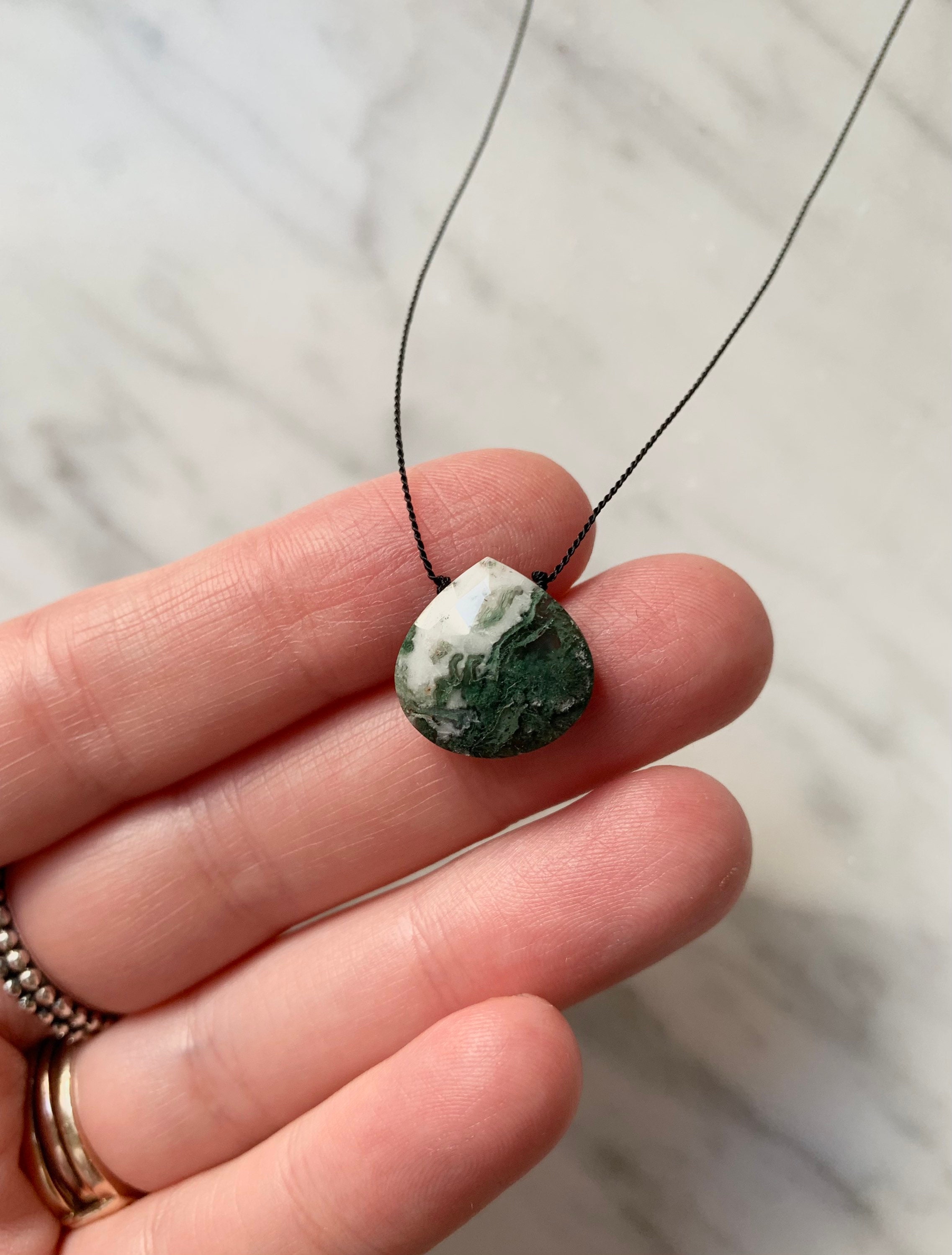 ✴︎H e a l i n g G e m D r o p N e c k l a c e ✴︎- Natural faceted MOSS AGATE bead on black nylon cord necklace, finished with sterling silver clasp.