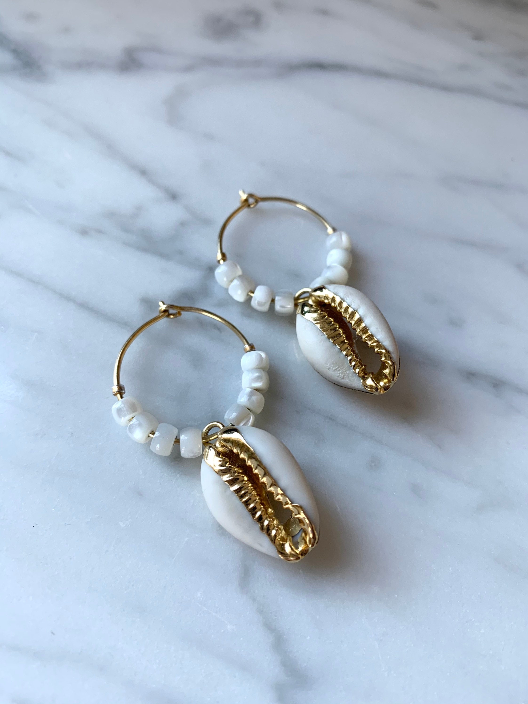 ❤︎ 20mm hoop earrings. Cowrie pieces vary slightly in size. * Refer to last photo for reference.*